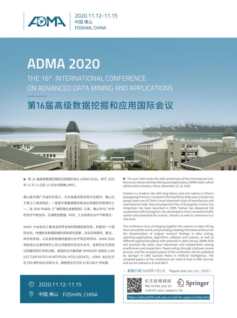The 16th International Conference on Advanced Data Mining and Applications (ADMA)November 12-15, 2020 in Foshan, Chinahttps://adma2020.nuit.edu.cn/index.htm The year 2020 marks the 16th anniversary o