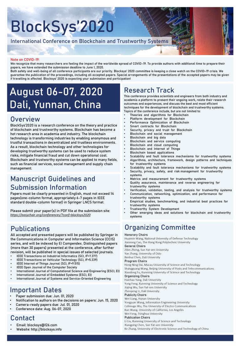 Call For Papers2020 International Conference on Blockchain and Trustworthy Systems (BlockSys'2020) Aug. 6 - 7, 2020, Dali City, Chinahttp://blocksys.info/ Note on COVID-19We recognize that many re