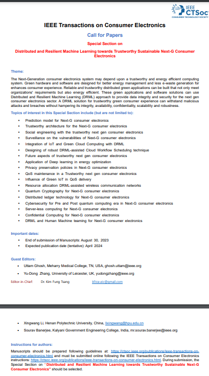 IEEE Transactions on Consumer Electronics,Distributed and Resilient Machine Learning towards Trustworthy Sustainable Next-G Consumer Electronics,(Deadline: August 30, 2023)