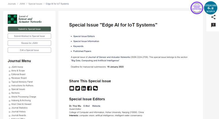 由我,中南財(cái)經(jīng)政法萬(wàn)少華老師與馬來(lái)亞大學(xué)Shivakumara Palaiahnakote老師共同組織的???ldquo;Edge AI for IoT Systems”已經(jīng)在 Journal of Sensor and Actuator Network (JCR Q1,ESCI, CiteScore:6.2)上線。??饕P(guān)注人工智能與邊緣計(jì)算的交叉理論,技術(shù)與應(yīng)用研究。