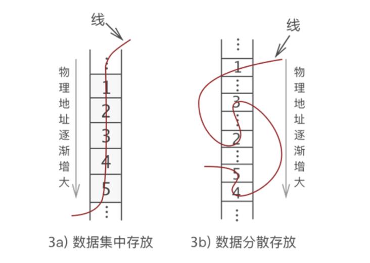 圖 2 中,左側是“串”起來的數(shù)據(jù),右側是空閑的物理空間。把這“一串兒”數(shù)據(jù)放置到物理空間,我們可以選擇以下兩種方式,如圖 3 所示。