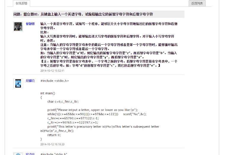 他還很好的運用了課程平臺提供的師生“互動交流”功能,在這個模塊,曾老師開設程序擂臺題,不僅鼓勵了學生更好的使用這個平臺,也增進了學生們對于C語言編程的興趣。