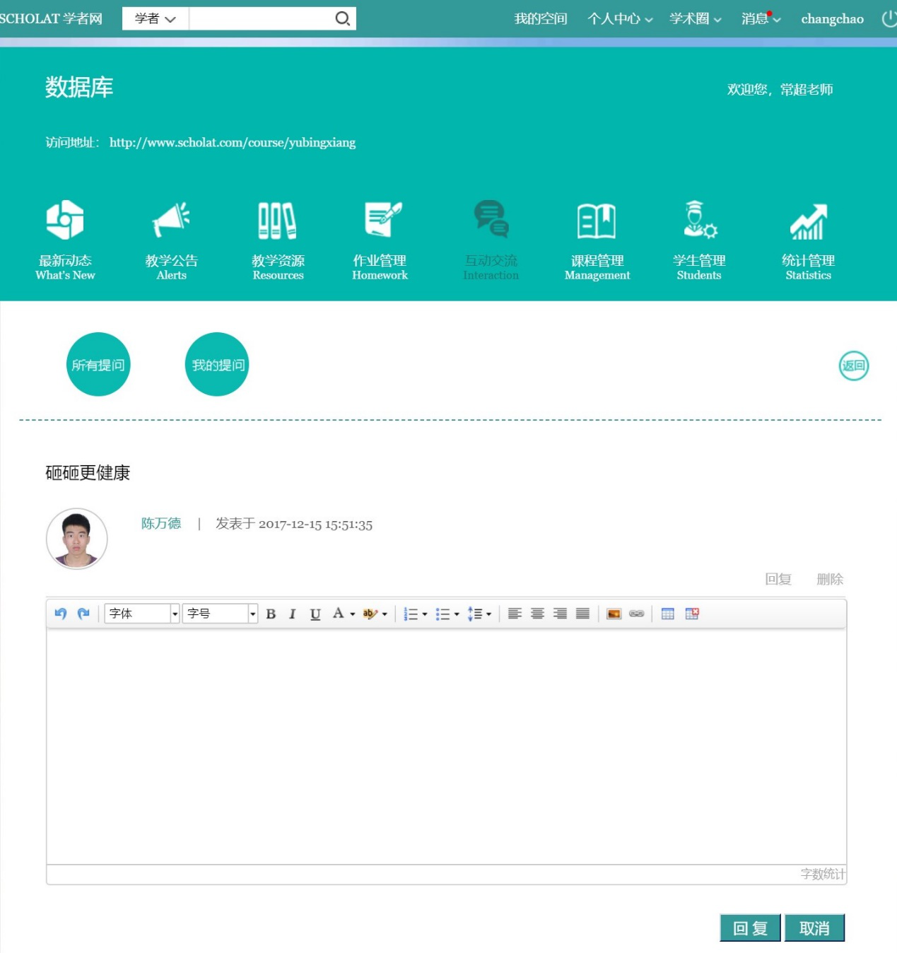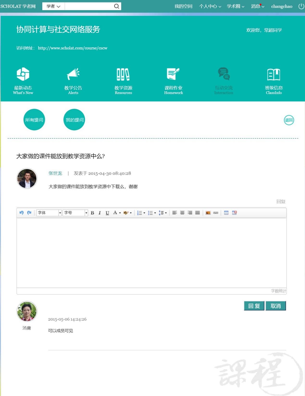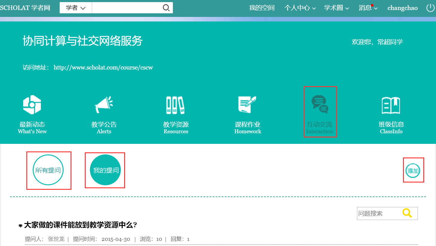 學(xué)生通過“進入課程”—>“互動交流”,進入互動交流界面