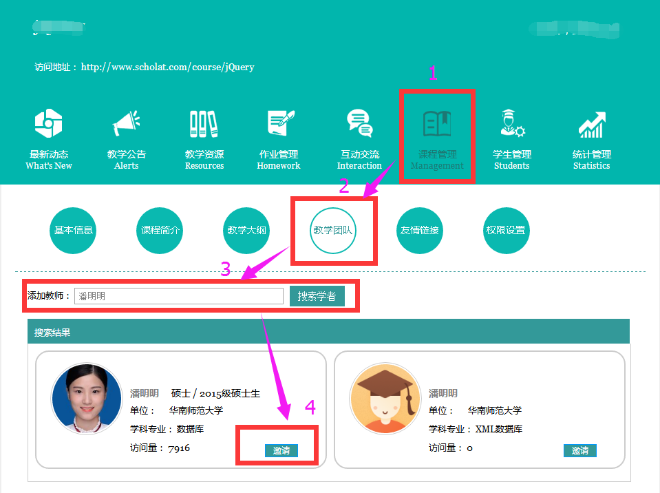 4、在搜索結(jié)果中,邀請要添加的課程教師,等待被邀請教師的同意即可。