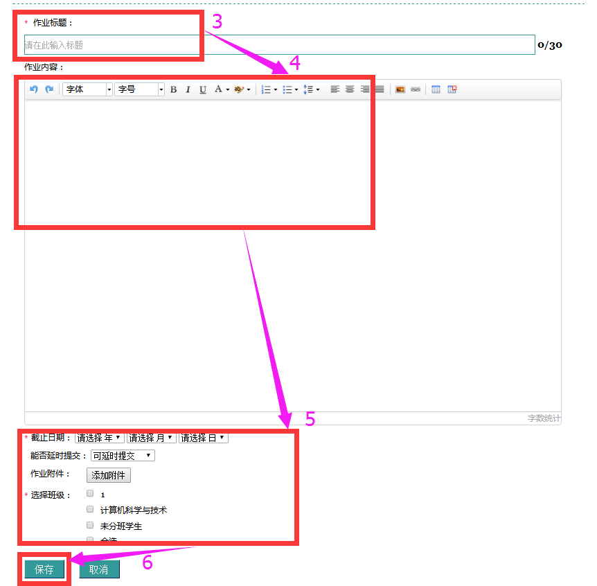 4、分別輸入作業(yè)標(biāo)題、內(nèi)容,設(shè)置作業(yè)截至日期、是否允許學(xué)生延遲提交、選擇布置作業(yè)的班級等