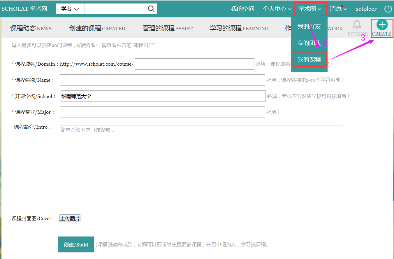 2、點擊右上角“CREATE”圖標(biāo),并根據(jù)相關(guān)提示及要求進行填寫課程信息,最后單擊“創(chuàng)建/Build”按鈕即可創(chuàng)建新課程。如下圖所示: