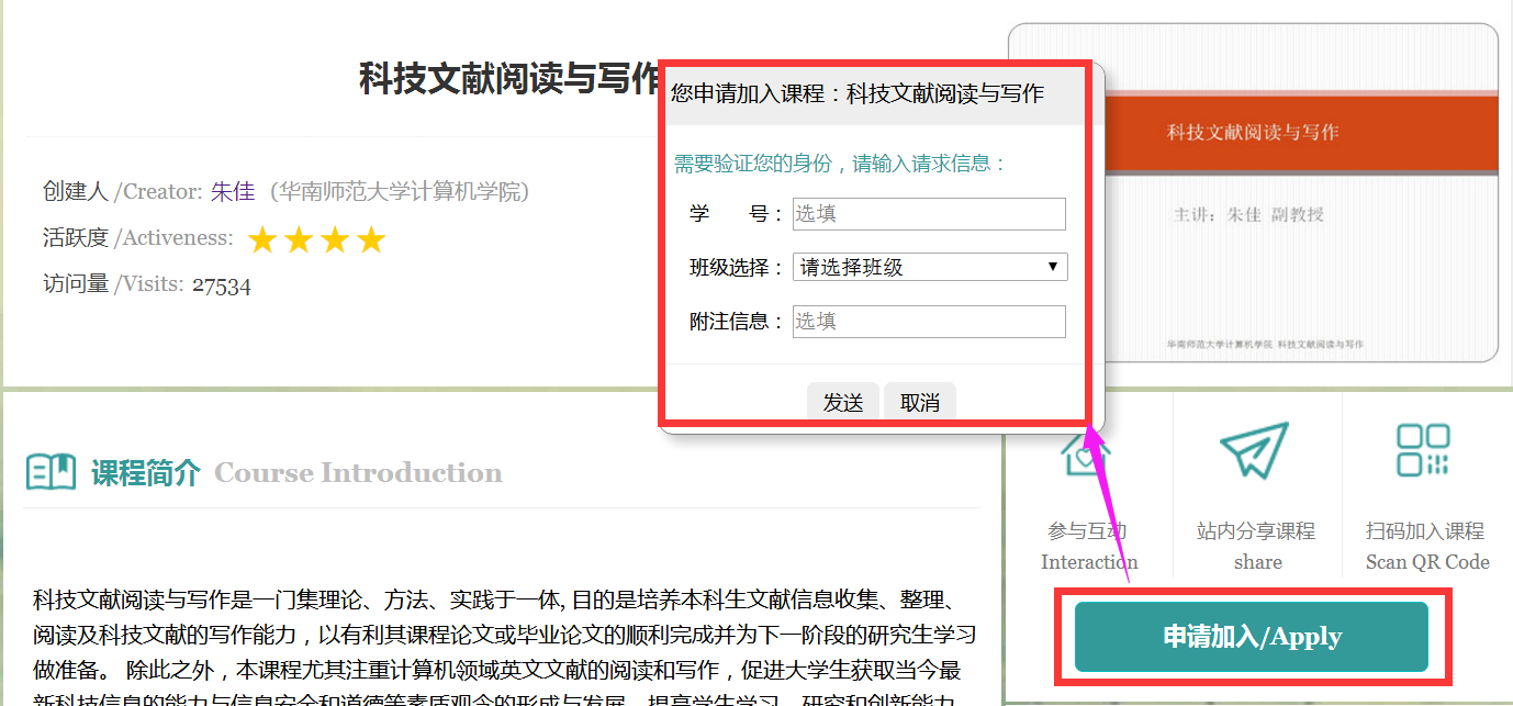 1、首先進入想要加入課程的首頁,單擊“申請加入/Apply”按鈕,便彈出身份驗證信息窗口;
