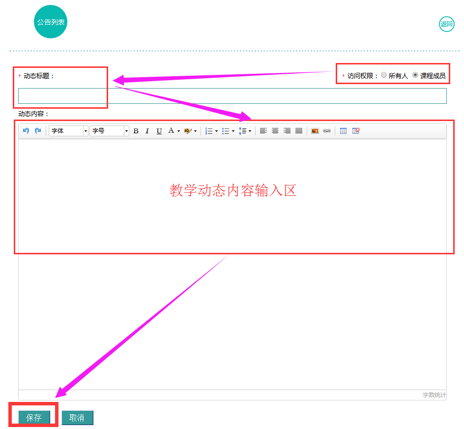 4、在編輯區(qū)域內(nèi)中,輸入動態(tài)標(biāo)題、動態(tài)內(nèi)容后,單擊“保存”按鈕即可成功發(fā)布教學(xué)公告。Tips:這里還可以設(shè)置訪問權(quán)限哦!
