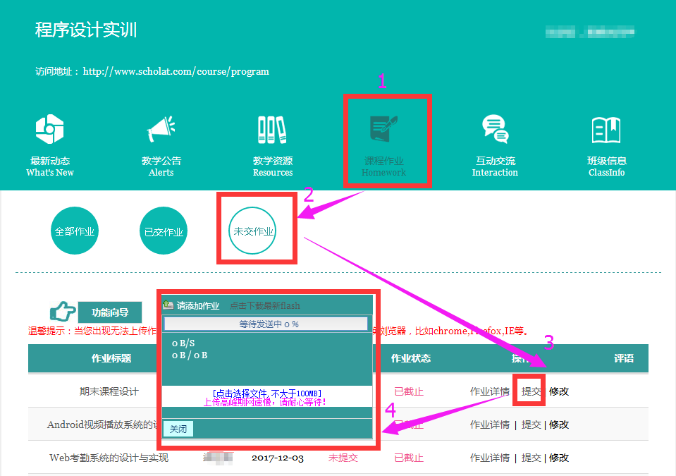 2、通過“課程作業(yè)”->“未交作業(yè)”,顯示未交作業(yè)列表