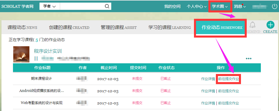 1、登錄學(xué)者網(wǎng),通過“學(xué)術(shù)圈”—>“我的課程”—>“作業(yè)動態(tài)”,進入作業(yè)動態(tài)頁;
