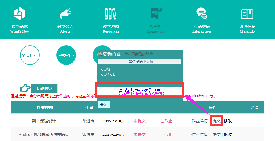 3、在相應(yīng)的作業(yè)中,單擊“提交”按鈕,彈出上傳作業(yè)的窗口,上傳要提交的作業(yè)即可。