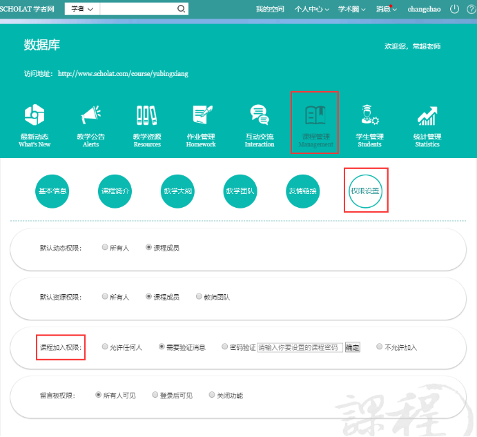 2、教師通過“后臺管理”—>“課程管理”—>“權(quán)限設(shè)置“,進入權(quán)限設(shè)置界面;