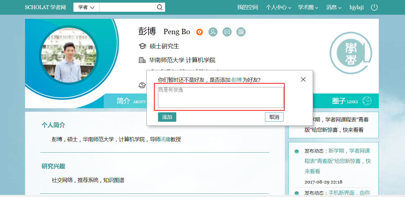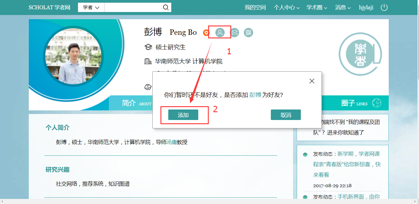 2、點(diǎn)擊學(xué)者頁面的添加好友按鈕,在彈出框中點(diǎn)擊“添加”按鈕,如圖1: