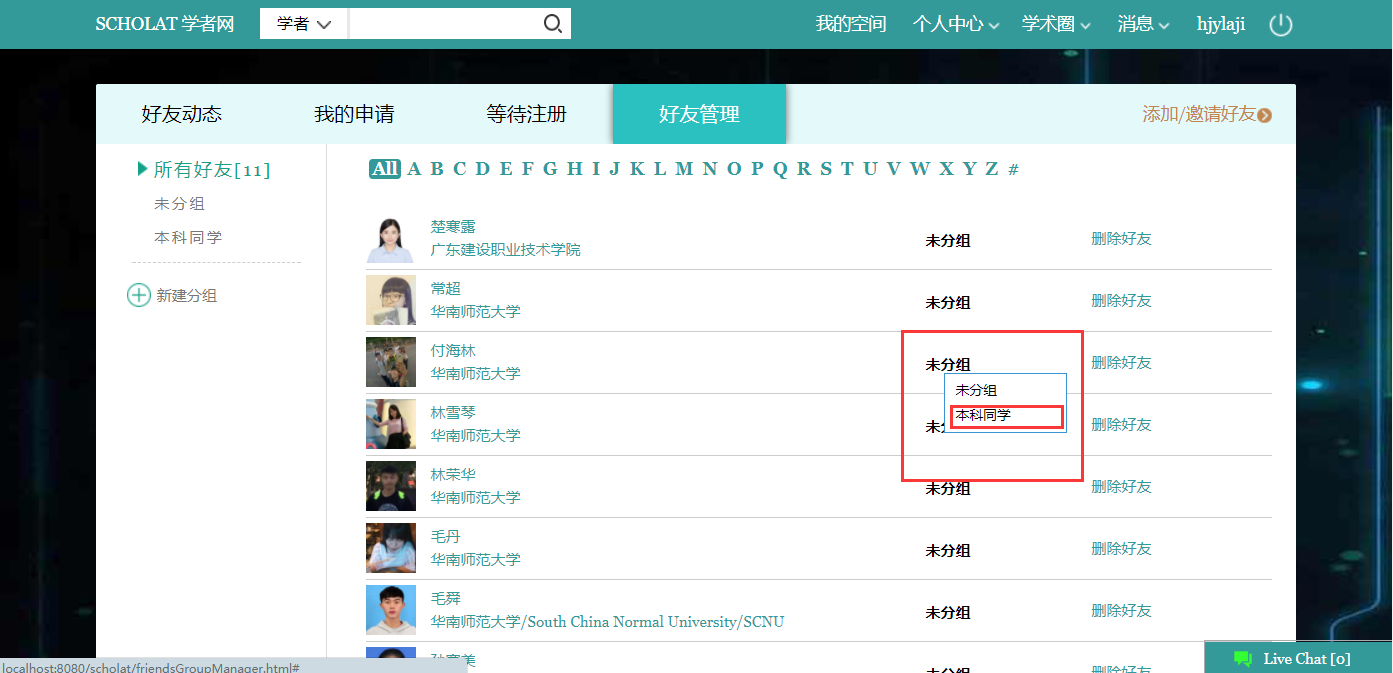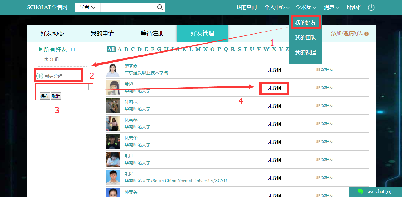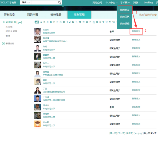 1、登錄學(xué)者網(wǎng),通過學(xué)者網(wǎng)導(dǎo)航中的“學(xué)術(shù)圈”—> “我的好友”進(jìn)入到好友管理界面;