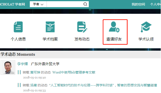 2、個人空間界面入口:登錄學(xué)者網(wǎng),在個人空間中點(diǎn)擊“邀請好友”,進(jìn)入到“邀請好友”界面,如圖4;