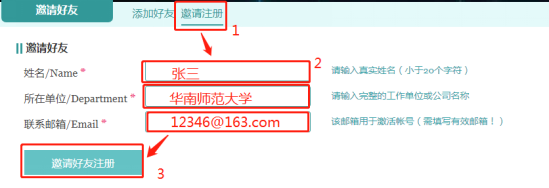 2、點(diǎn)擊“邀請注冊”,填入姓名、所在單位、聯(lián)系郵箱;