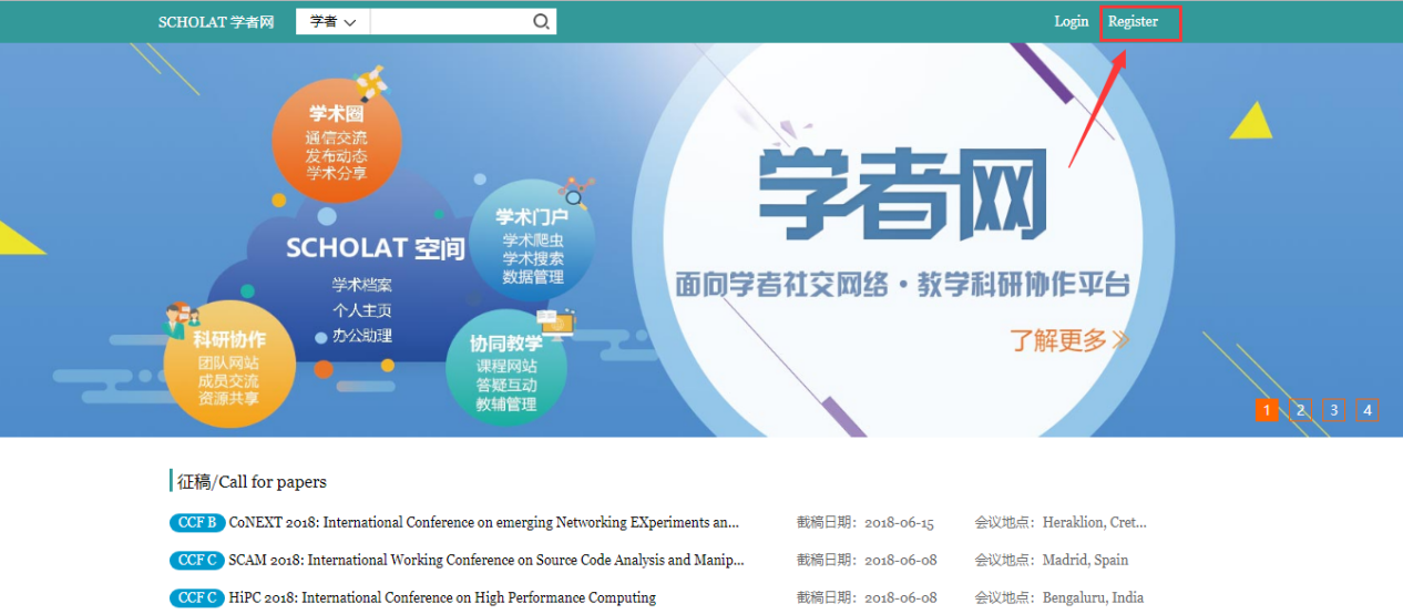 1.打開學(xué)者網(wǎng)首頁(yè),在右上角,點(diǎn)擊“Register”按鈕,免費(fèi)注冊(cè);