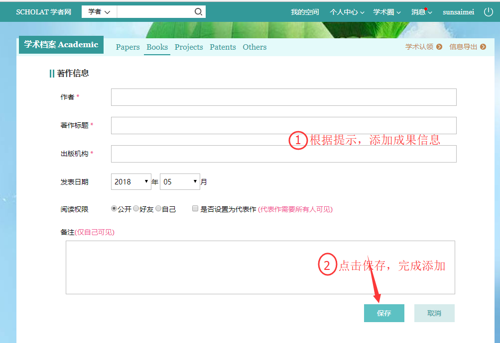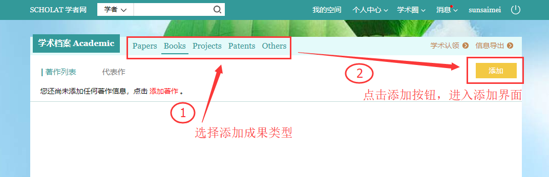 如果您還沒有添加學(xué)術(shù)成果,請(qǐng)登錄個(gè)人賬號(hào),進(jìn)行添加,具體操作步驟如下:
