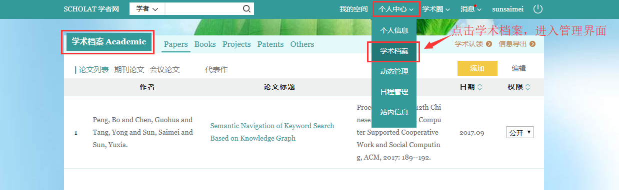 1.登錄學(xué)者網(wǎng),進(jìn)入個(gè)人空間,點(diǎn)擊“個(gè)人中心-->學(xué)術(shù)檔案”,進(jìn)入學(xué)術(shù)檔案管理界面;