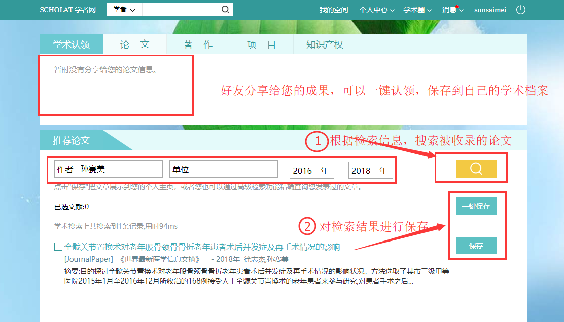 3.學(xué)術(shù)認(rèn)領(lǐng)界面學(xué)者對(duì)應(yīng)類型,進(jìn)行成果認(rèn)領(lǐng),或者通過(guò)檢索進(jìn)行論文保存;