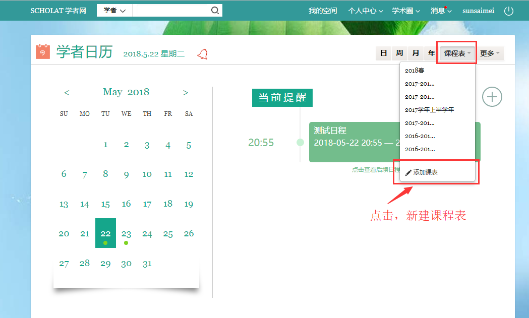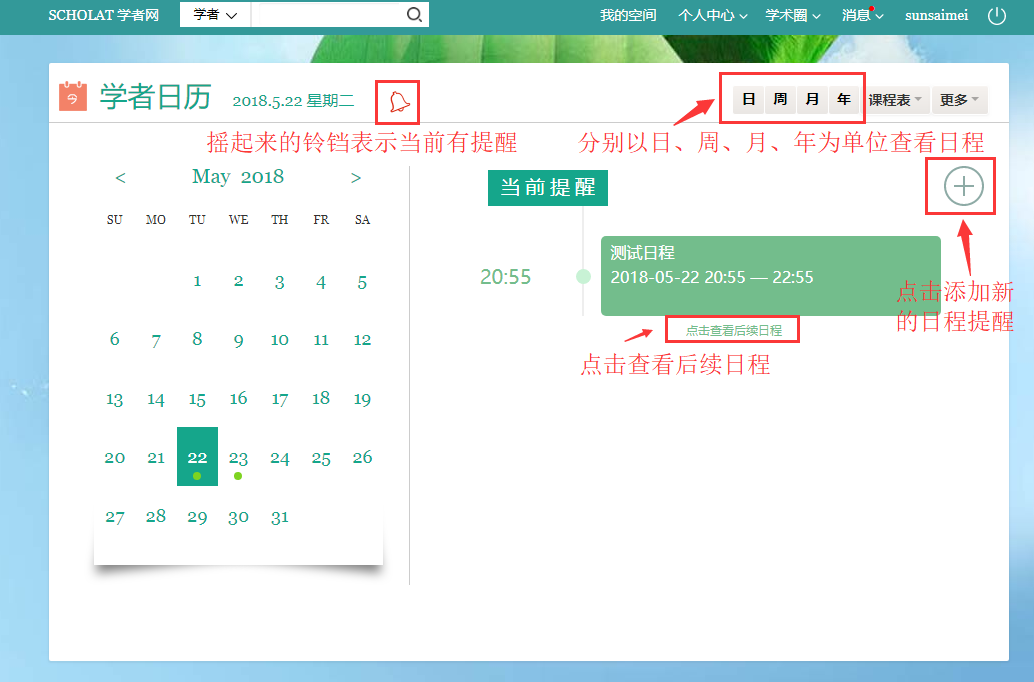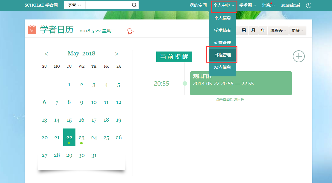 1.登錄學(xué)者網(wǎng),進(jìn)入個(gè)人空間,點(diǎn)擊“個(gè)人中心-->日程管理”,進(jìn)入日程管理界面;
