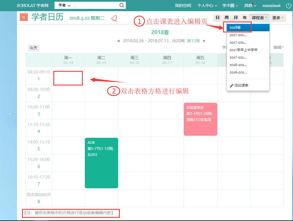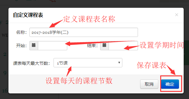 3.定義完課表可進(jìn)入課表編輯頁(yè)面,雙擊表中方格進(jìn)行編輯或修改;