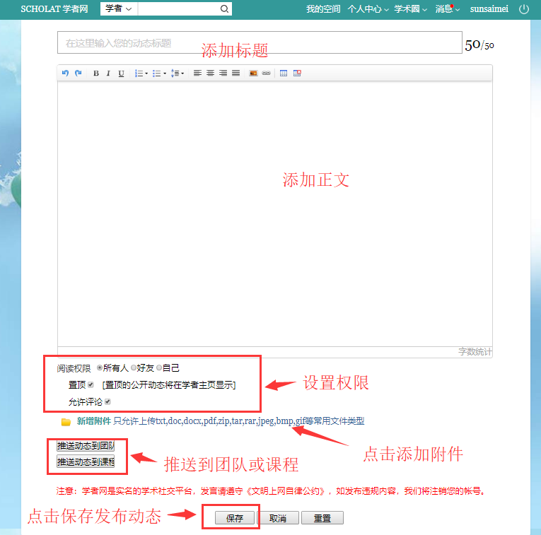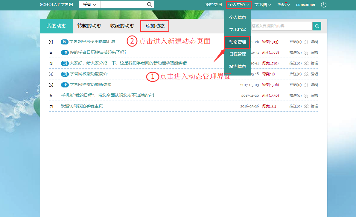 1.登錄學(xué)者網(wǎng)。進(jìn)入個(gè)人空間,點(diǎn)擊“個(gè)人中心-->動(dòng)態(tài)管理-->添加動(dòng)態(tài)”,進(jìn)入動(dòng)態(tài)編輯頁(yè)面;