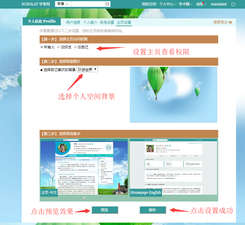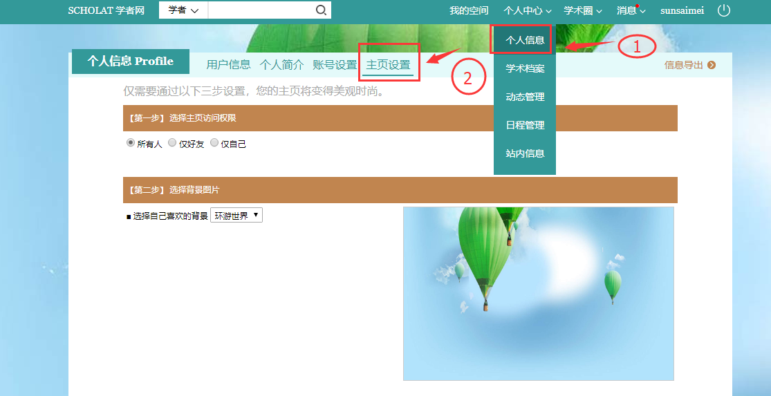 1.登錄學(xué)者網(wǎng),進(jìn)入個(gè)人空間,點(diǎn)擊“個(gè)人中心-->個(gè)人信息-->主頁(yè)設(shè)置”,進(jìn)入主頁(yè)設(shè)置界面;