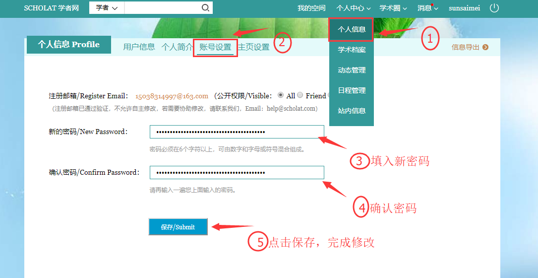 登錄學(xué)者網(wǎng),進(jìn)入個(gè)人空間,點(diǎn)擊“個(gè)人中心-->個(gè)人信息-->賬號(hào)設(shè)置”,進(jìn)入修改頁(yè)面,根據(jù)頁(yè)面提示,填入密碼,再次確認(rèn)密碼,點(diǎn)擊保存,完成密碼修改。