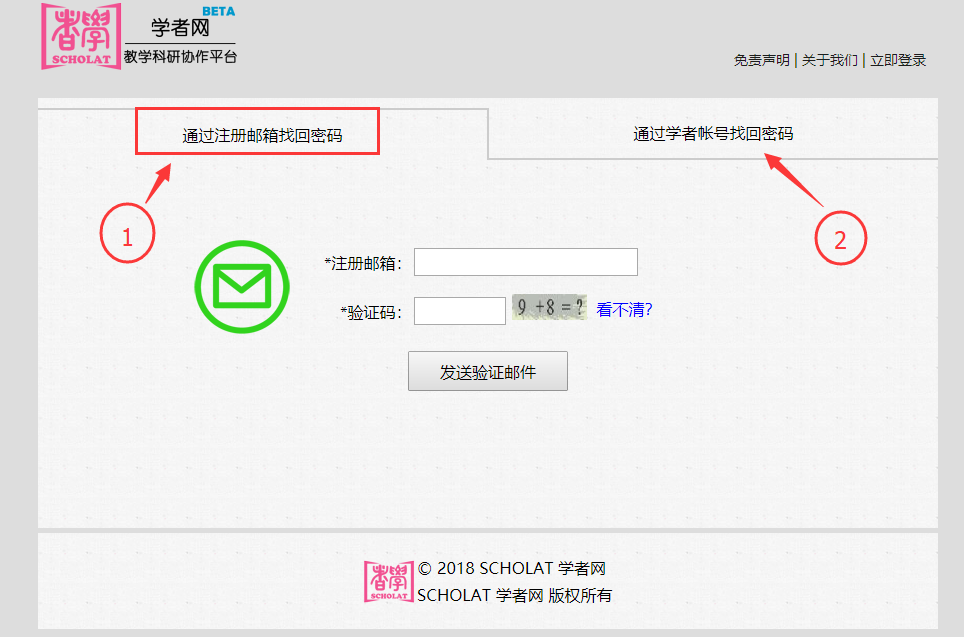2.在找回密碼頁(yè)面,可通過(guò)兩種方式找回密碼:1)注冊(cè)郵箱 2)學(xué)者網(wǎng)賬號(hào)。填入注冊(cè)郵箱或者學(xué)者網(wǎng)賬號(hào),點(diǎn)擊發(fā)送驗(yàn)證郵件;