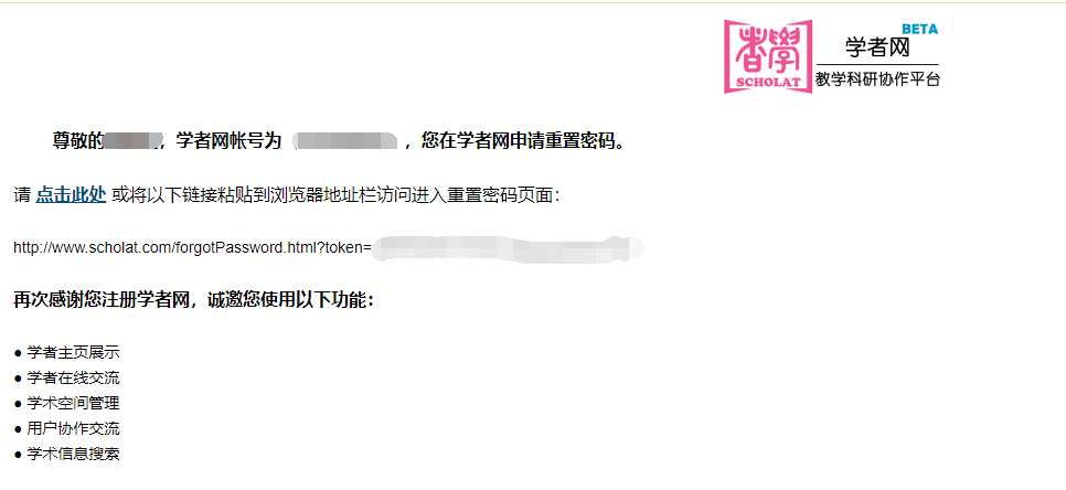 3.登錄注冊(cè)郵箱,打開學(xué)者網(wǎng)用戶密碼重置郵件,點(diǎn)擊鏈接,修改密碼。