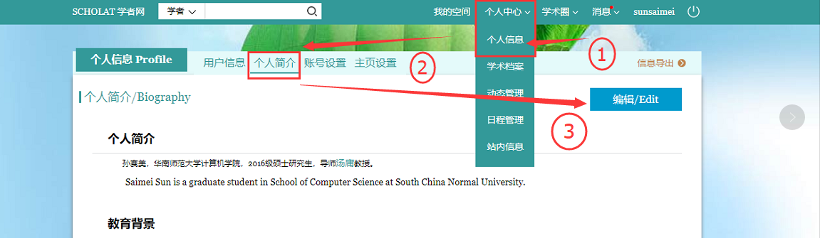 1.登錄學(xué)者網(wǎng),點(diǎn)擊“個(gè)人中心-->個(gè)人信息-->編輯/Edit”,進(jìn)入檔案編輯頁(yè)面;