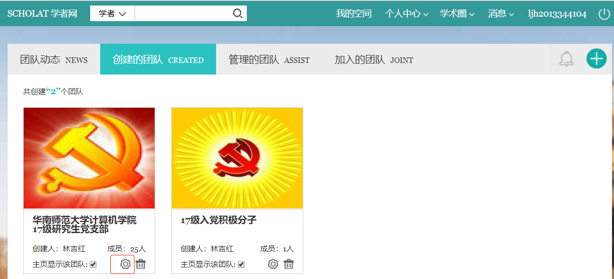 1.登陸學(xué)者網(wǎng)→查看主菜單欄→學(xué)術(shù)圈→單擊我的團(tuán)隊(duì)→單擊綠色加號(hào)→填寫相關(guān)必填資料后即可創(chuàng)建