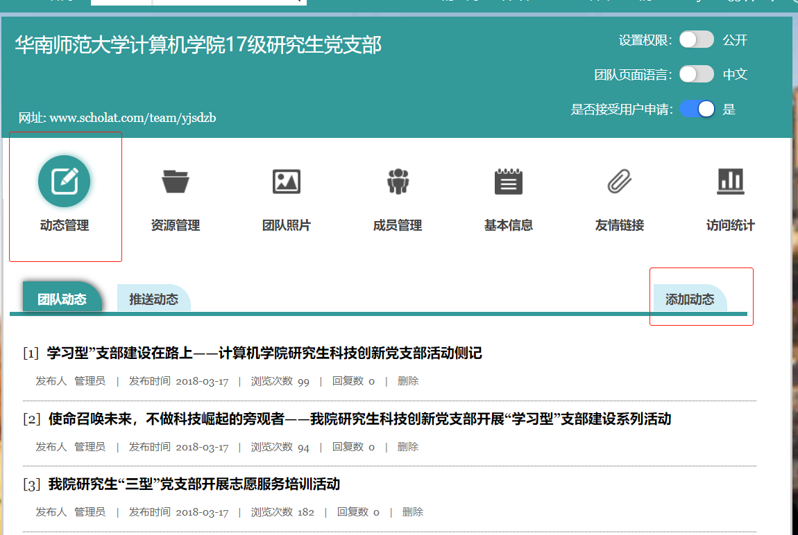 1.管理員進(jìn)入團(tuán)隊(duì)后臺(tái)→動(dòng)態(tài)管理→添加動(dòng)態(tài)
