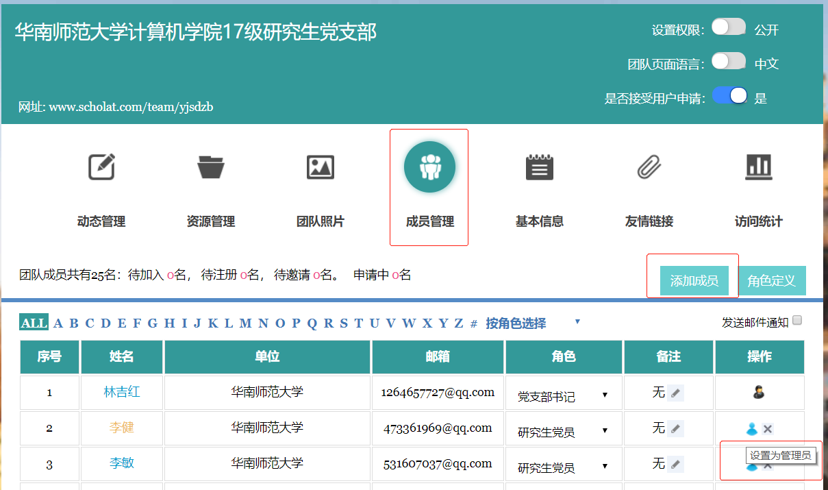 2.成員管理→在相應(yīng)成員后面,單擊藍(lán)色小人→即可