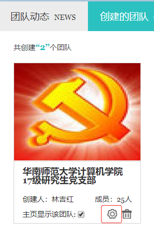 1.我的團(tuán)隊(duì)→單擊相應(yīng)團(tuán)隊(duì)的設(shè)置→進(jìn)入團(tuán)隊(duì)的后臺(tái)管理
