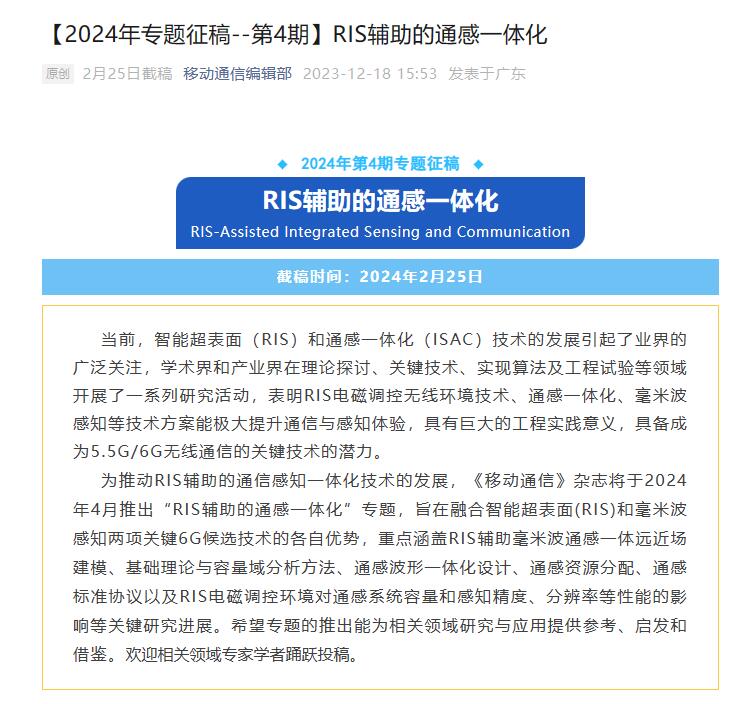 徐勇軍老師受邀擔(dān)任移動(dòng)通信《RIS輔助的通感一體化》特刊編輯