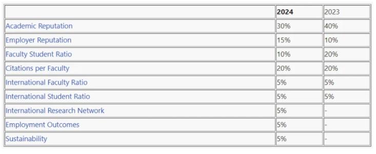 和2023年相較,調(diào)整后,學(xué)術(shù)聲譽(yù)和師生比例兩項(xiàng)都有所下降,也就是說(shuō)在這兩項(xiàng)評(píng)分落后的大學(xué)排名將會(huì)獲得提升;