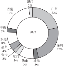 近十多年來 ,粵九市 GDP 在粵港澳大灣區(qū)中的占比不斷提升 ,而 2023 年香港與澳門的 GDP 在粵港澳大灣區(qū)中的占比出現(xiàn)回升。2023 年香港與澳 門的 GDP 占大灣區(qū)比重約為 21%( 見圖2),較 2022 年上升 1. 8 個百分點。 分析其原因 ,一方面 ,赴港 、赴澳游客數(shù)量恢復式增長 ,帶動港澳旅游業(yè)、 商業(yè)和博彩業(yè)快速復蘇 ;另一方面,2023 年人民幣對港元 、澳門元出現(xiàn)貶 值 ,導致港澳以人民幣計價的 GDP 回升。