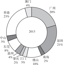 圖 2 2013 年和 2023 年粵港澳大灣區(qū)各城市 GDP 占比的變化 數(shù)據(jù)來源 :WIND、各地統(tǒng)計部門。