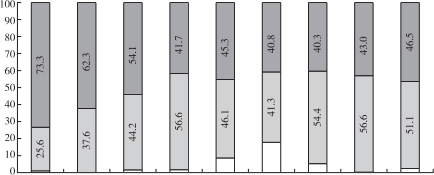 圖 5 2011~2023 年粵九市三次產(chǎn)業(yè)結(jié)構(gòu)變化 數(shù)據(jù)來源 :CEIC、Wind。