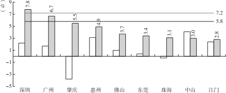 從粵九市各市情況來看, 2023 年經(jīng)濟增速位次較上年出現(xiàn)較大變動。 其中 ,深圳市地區(qū)生產(chǎn)總值同比增長 6. 0%, 位居各市第一 ;惠州與中山均 同比增長 5. 6%, 并列第二 ;江門 、佛山分別同比增長 5. 5%和 5. 0%, 位列 第四 、第五位 ;廣州 、珠海 、肇慶 、東莞同比增速低于平均水平 。惠州連續(xù) 兩年經(jīng)濟增速保持粵九市領(lǐng)先地位,2022 年、2023 年惠州 GDP 增速分別為 4. 2%和 5. 6%, 得益于其制造業(yè)產(chǎn)業(yè)升級 , 圍繞電子信息 、新能源等產(chǎn)業(yè)積 極強鏈補鏈 ,外資退出和外需減弱的沖擊影響較小 。相比之下 ,東莞 GDP 增速在粵九市中連續(xù)兩年排名靠后, 2022 年、 2023 年 GDP 增速分別為 0. 6%和 2. 6%, 主要原因是其出口導向型制造業(yè)受全球需求回落沖擊影響較 大以及部分產(chǎn)業(yè)外遷。