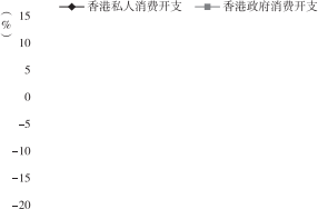 (2023) 》 中對應數(shù)據(jù)為同比下降 1. 0%, 數(shù)據(jù)有所變化的原因在于香港特區(qū)政府對 2022 年 GDP 數(shù)據(jù)進行了修訂 ,而 2023 年報告采用的數(shù)據(jù)為初步核算值 。下文香港政府消費開 支 、澳門私人與政府消費開支的數(shù)據(jù)與 2023 年報告中數(shù)據(jù)相比發(fā)生變化的原因類似。