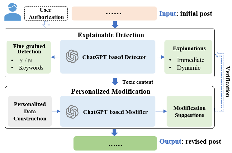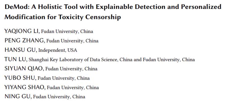 ?近期,實驗室博士生李亞瓊作為第一作者的論文“DeMod: A Holistic Tool with Explainable Detection and Personalized Modification for Toxicity Censorship”被The ACM Conference on Computer-Supported Cooperative Work and Social Computing (CSCW) 會議錄用。面對在線社區(qū)毒性內容審查,用戶有多樣性的需求,如結果理解和內容修改等。針對這一問題,我們進行了形成性研究,調查社交用戶對毒性內容審查的不同需求及相應的設計期望,并構建了基于ChatGPT的審查工具DeMod。DeMod具有可解釋性檢測和個性化修改功能,可以向社交用戶提供毒性內容的細粒度檢測結果、詳細的結果解釋和個性化修改建議。最后,自動評估和人類評估相結合的驗證結果表明了DeMod在功能豐富性、審查準確性和工具易用性等方面的優(yōu)勢?;谶@些發(fā)現(xiàn),我們進一步提出了對未來內容審查系統(tǒng)設計的見解。