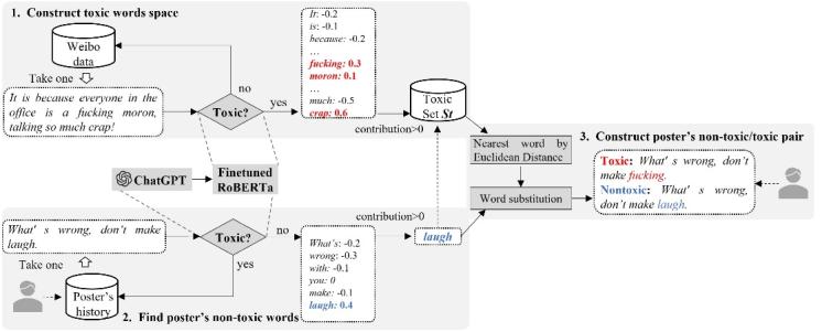 2. 個性化修改器(Personalized Modifier):實證研究表明,用戶希望修改建議不僅能幫助他們去除帖子中的毒性內容,還能盡量保留原帖的語義和用戶的個性化語言風格。我們發(fā)現(xiàn),直接使用類似于檢測任務的提示詞讓大模型執(zhí)行毒性內容修改任務具有挑戰(zhàn)性,很難同時實現(xiàn)這些多重目標。然而,大模型具備小樣本學習能力,即Few-shot Learning。如果提供一些展示原始帖子(包含毒性內容)與相應修改后的內容(去除毒性但保留相似語義和用戶語言風格)的示例對,大模型可以更好地實現(xiàn)這些修改目標。因此,我們通過構建毒性詞空間、基于無毒樣例構造毒性樣例、無毒/毒性樣例對翻轉等步驟構建面向社交用戶的個性化修改樣例對,如圖2所示,以此提升基于ChatGPT的個性化修改器的效果。