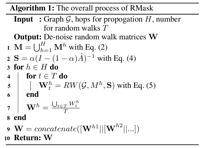 給定指定的跳躍數(shù)和圖結(jié)構(gòu),我們首先根據(jù)圖結(jié)構(gòu)對每個節(jié)點執(zhí)行帶有屏蔽機制的隨機游走。然后聚合捕獲的圖結(jié)構(gòu)信息和特征以獲得不同跳躍的結(jié)果。
