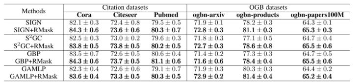 本文介紹了 RMask,這是一個即插即用的模塊,旨在增強現(xiàn)有的模型簡化 GNN 在更高速度下探索更深層次的圖形結(jié)構(gòu)的能力。作為插件方法, RMask可以與大多數(shù)模型簡化GNN無縫集成。實驗結(jié)果表明,RMask有效地提高了模型簡化GNN的準確性和效率。
