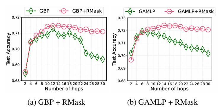 基于此,我們重新實現(xiàn)了帶噪聲掩蔽的SIGN。如圖1d所示,節(jié)點不僅可以捕獲高跳的有效信息,還可以消除過度平滑問題,如圖1e所示。隨著跳數(shù)的增加,準確率和平滑度趨于平穩(wěn)。