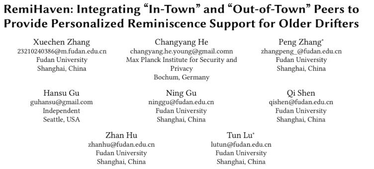 日前,實(shí)驗(yàn)室碩士生張雪琛作為第一作者的論文 “RemiHaven: Integrating 'In-Town' and 'Out-of-Town' Peers to Provide Personalized Reminiscence Support for Older Drifters” 被 CCF A類會(huì)議The ACM CHI Conference on Human Factors in Computing Systems (CHI) 會(huì)議錄用。該論文是復(fù)旦計(jì)算機(jī)學(xué)院與老齡研究院跨學(xué)科研究團(tuán)隊(duì)AI4SS(AI for Social Science)的最新研究成果。