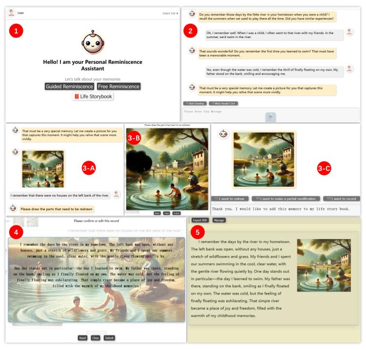 在本模塊中,系統(tǒng)利用前述的提示詞信息,生成個(gè)性化的回憶圖像和文本,幫助用戶重現(xiàn)過去的場(chǎng)景。用戶可以與助手進(jìn)行多輪迭代對(duì)話,對(duì)生成的回憶材料進(jìn)行回顧、修改和篩選,以確保最終的回憶內(nèi)容符合用戶的真實(shí)體驗(yàn)和情感需求。最終,生成的回憶內(nèi)容可以被整理成個(gè)性化的“回憶故事集”(Life Storybook),用戶可選擇將其導(dǎo)出和分享,以便長(zhǎng)期保存或與家人朋友共同回憶。這一功能使 RemiHaven 不僅是一個(gè)回憶支持工具,同時(shí)也能幫助用戶記錄和傳承個(gè)人的生活經(jīng)歷。